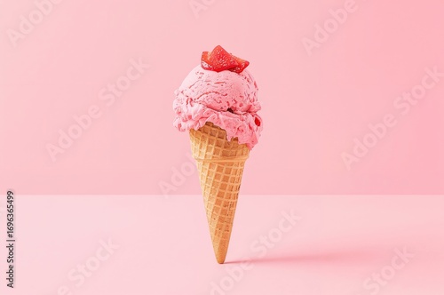 Strawberry-topped ice cream cone against a pink backdrop with space for text