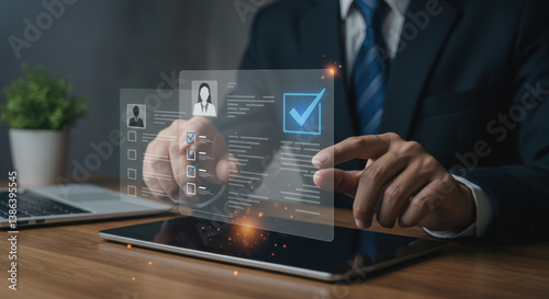 Streamlining HR: Businessman reviews candidate profiles on digital tablet, selection, talent acquisition, hiring process, modern recruitment.
