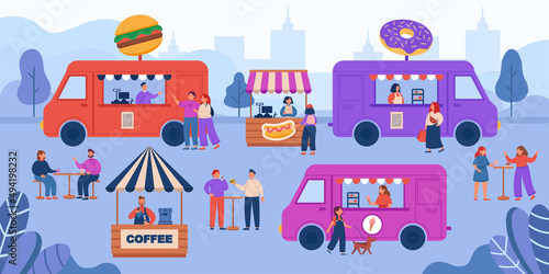 Street food trucks on city festival or fair. Crowds of people buying food from market vendors during event flat vector illustration. Summer, marketing, food, shopping, festival concept for banner