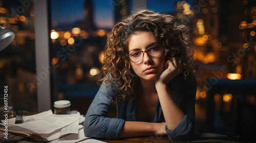 Stressed exhausted woman sitting at office desk and working overtime, she is overloaded with work