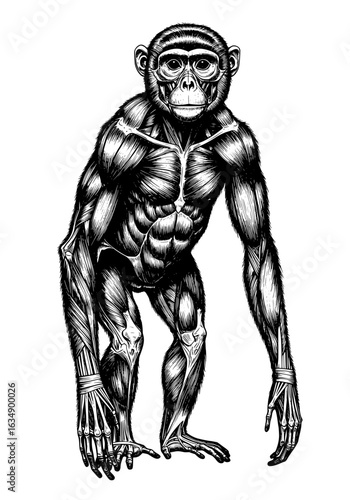 Striking anatomical illustration of chimpanzee muscles and skeleton, perfect for science and education projects