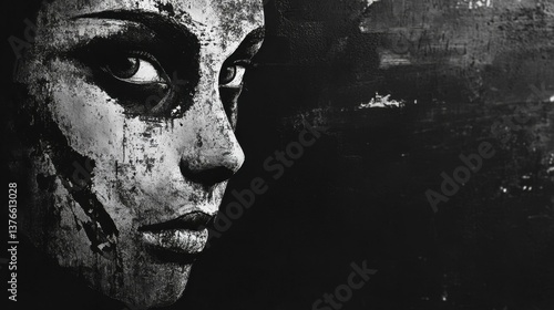 Striking Black and White Portrait of a Woman with Intense Gaze and Textured Face Paint