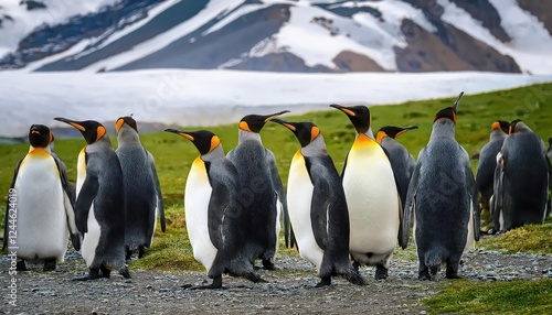 Striking Colony of King Penguins Against the Snowy Backdrop of South Georgia Island, Displaying a Spectacle of Black and White Plumage and Playful Interaction Amongst Icebergs.