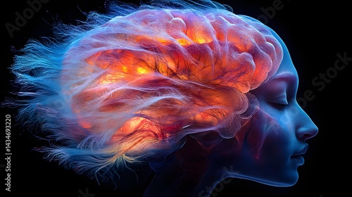 Striking profile art representing the human mind. A glowing brain emits energy, visualized as flowing strands. Thought and intelligence concept. Abstract Medical Pain