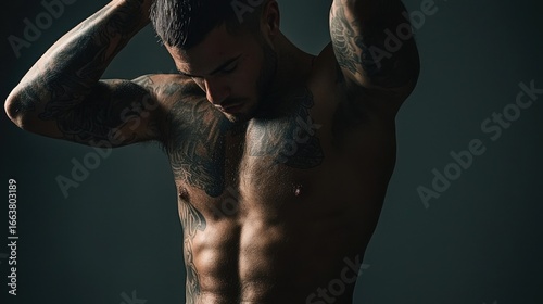 Strong man poses confidently in low lighting showcasing body art and muscular physique in an artistic studio setting