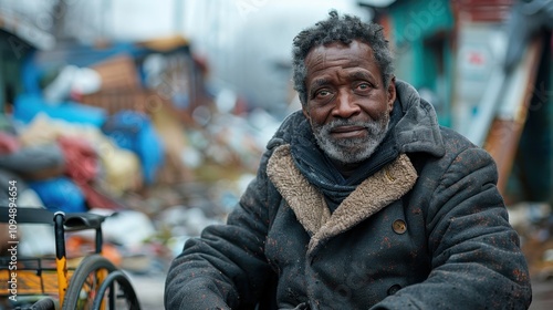 Struggles and resilience of an elderly man amidst urban decay in a winter setting. Generative AI