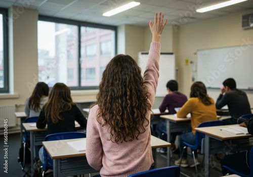 Student Raises Hand in Modern Classroom During Lesson Engagement