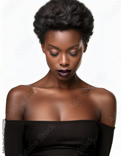 studio portrait of a black woman looking down with short hair wearing a low cut black top with nude shoulders on a white background, fashion photography