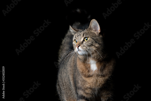 studio portrait of a tabby shorthair cat looking to the side on black background with copy space