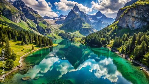 Stunning Aerial Drone View of Pristine Swiss Mountain Lake in Summer Alps
