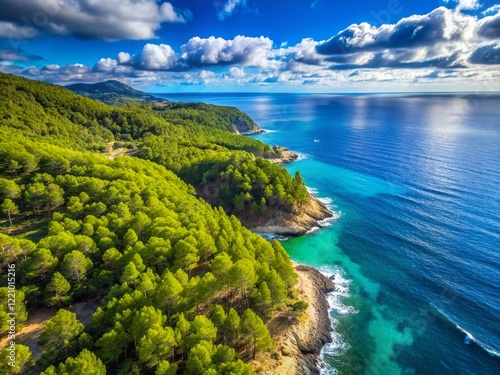 Stunning Aerial Drone View of Spain's Coastal Forest, Azure Sea, and Blue Sky