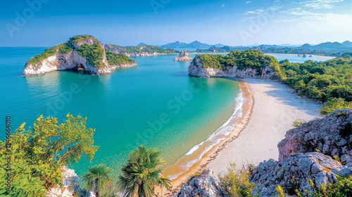 stunning aerial view showcases tropical beach with clear turquoise waters, lush greenery