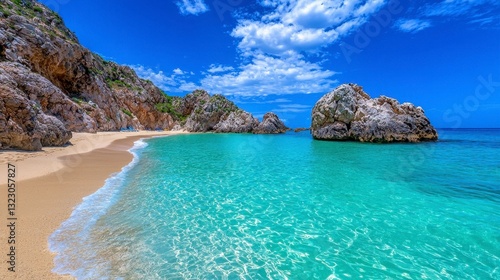 Stunning beach landscape featuring striking rock formation surrounded by crystal clear waters on a sunny day