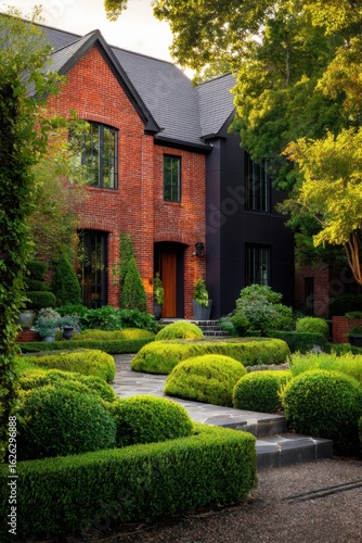 Stunning brick house with modern design surrounded by lush greenery and well-manicured hedges in a serene neighborhood during the golden hour