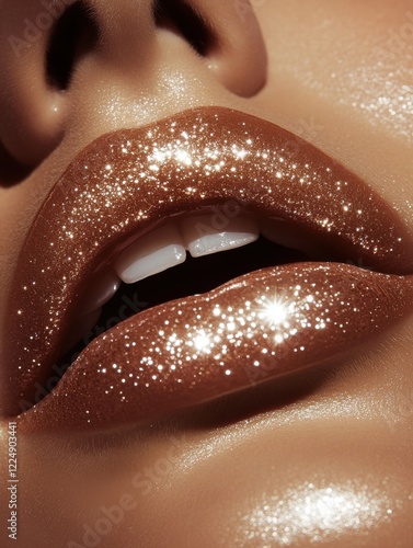Stunning close-up of sparkling lips enhanced with glitter and smooth makeup showcasing a radiant beauty look in natural light