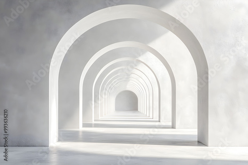 Stunning minimalist architecture featuring a series of arches in a spacious, light-filled corridor with a neutral color palette.