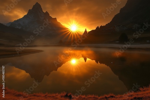 Stunning Mountain Sunrise Over Calm Reflection Lake