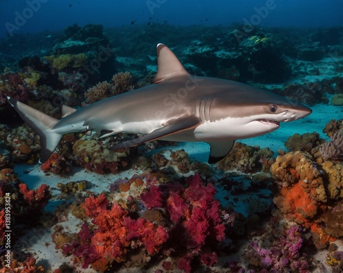 Stunning portrait of blacktip reef shark swimming near vibrant coral reef with sunlight filtering through clear water