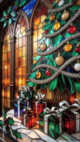 Stunning stained glass Christmas tree adorned with colorful ornaments and presents, radiates festive cheer and holiday magic creating joyful anticipation