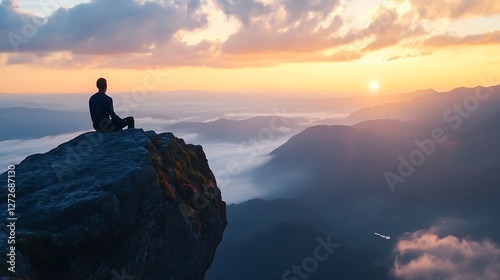 Stunning Sunrise View from Mountain Peak with Silhouette of a Person Meditating : Generative AI