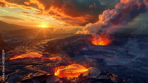 Stunning sunset over an active volcano, with fiery hues reflecting off the clouds and illuminating the rugged landscape below