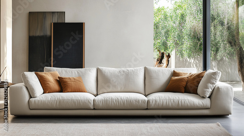 Stylish and cozy beige living room with beige sofa and beige walls and interior