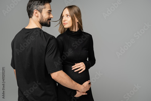 Stylish and pregnant woman in black dress touching belly and looking at bearded husband in t-shirt while standing isolated on grey, new beginnings and anticipation concept