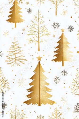 Stylish Christmas pattern featuring gold trees and delicate snowflakes on a white background, evoking a festive and elegant holiday atmosphere.