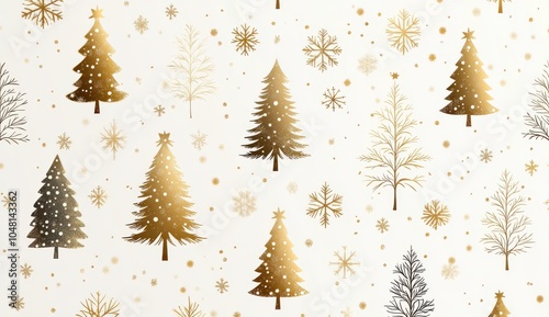 Stylish Christmas pattern with gold and black trees and delicate snowflakes on a white background, capturing an elegant and festive feel for seasonal designs or winter-themed decorations.