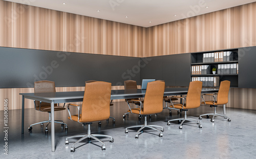 Stylish conference room with brown chairs and long table, modern graphic style, wood panel background. Concept of elegant office interior design. 3D Rendering