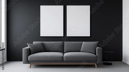 Stylish gray sofa against a sleek black wall, complemented by empty white frames, creating a modern living space.