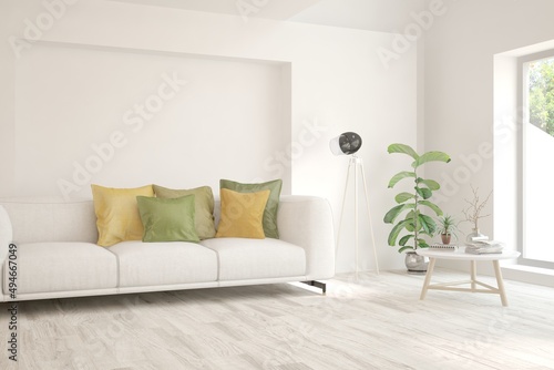 Stylish room in white color with sofa. Scandinavian interior design. 3D illustration
