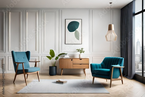 Stylish scandinavian living room interior of modern apartment with wooden commode, design armchair, carpet, leaf in vase, table lamp and personal accessories in unique home decor. Template.