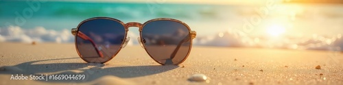 Stylish sunglasses resting on a beach, reflecting the sun's glare Perfect for summer, travel, and vacation imagery Shows off the design and quality of the shades , ocean, premium
