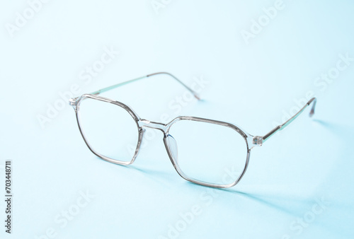 Stylish white plastic eyeglasses isolated on light blue background perspective view