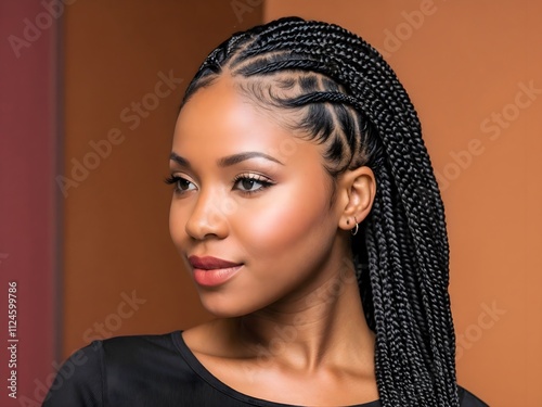 stylish woman with an intricate braided hairstyle exudes confidence and beauty