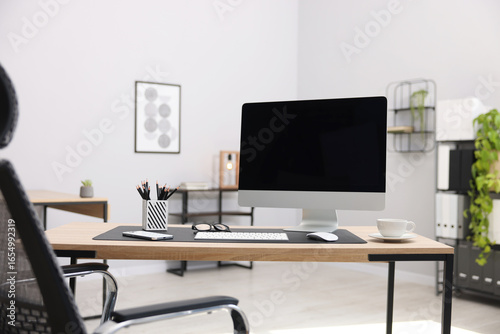 Stylish workplace with modern computer and stationery on wooden table in office