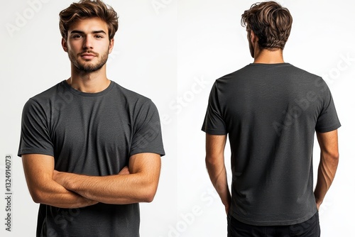 Stylish young man poses confidently in a modern studio setting wearing a simple dark t-shirt and showcasing a casual yet trendy look