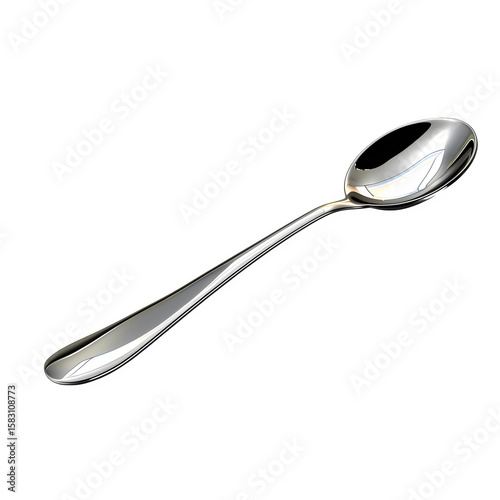 stylized 3D cartoon render of a stainless steel spoon with thick stem and oversized round bowl, soft reflections and white background
