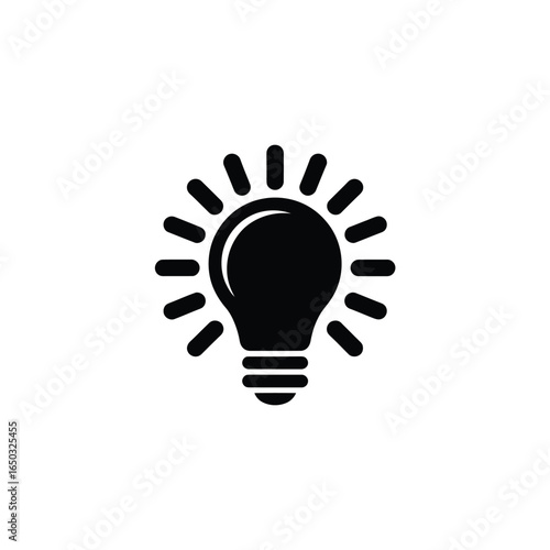 Stylized Black Light Bulb Icon with Rays, Symbolizing Ideas and Innovation on White Background