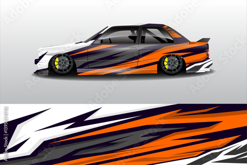 Stylized car illustration featuring vibrant orange and purple graphics on a sleek vehicle design