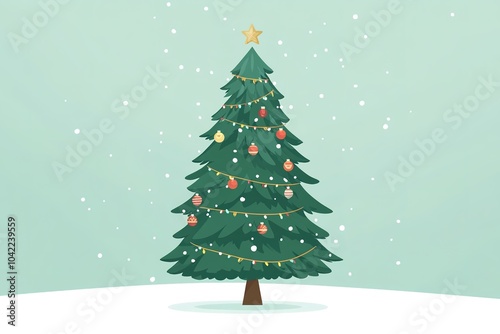 Stylized Christmas tree with decorations under snowfall
