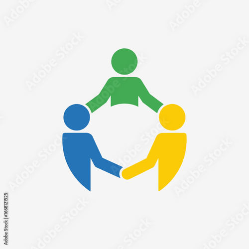 Stylized figures in a circle holding hands representing unity and teamwork.