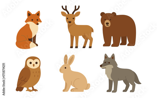 Stylized forest animals in flat design featuring fox, deer, bear, owl, rabbit, and wolf