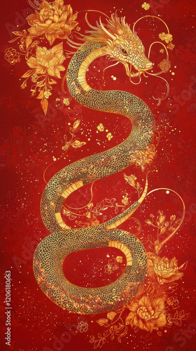 Stylized Golden Snake Coiled Against Red Background with Festive Floral Elements