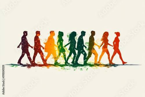 Stylized illustration of six walking figures in a spectrum of colors resembling a progression set against a white background evoking unity movement and diversity in stride