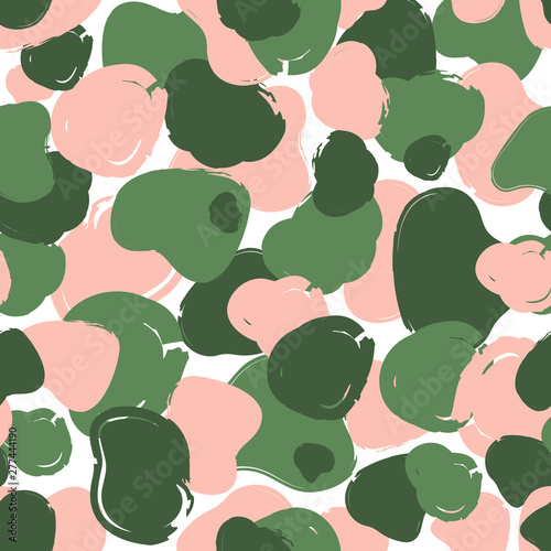 Stylized military seamless pattern of pink and green elements. Hand drawn vector Illustration