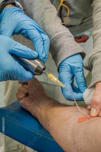 Subjective image at the time of radioactive contrast agent injection in a cancer patient undergoing a PET scan. Bologna, Italy