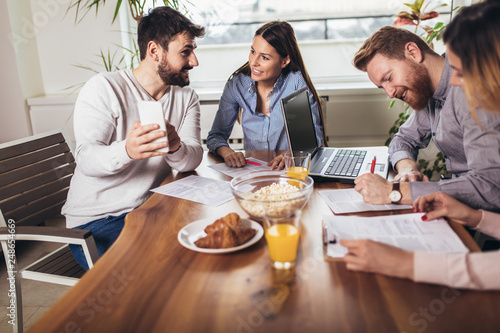 Successful start-up team in training. Business team working on marketing strategy. Brainstorming meeting concept.
