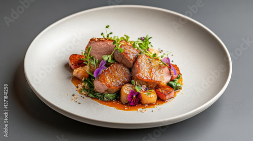 Succulent gourmet dish featuring tender meat, vibrant vegetables, and artistic presentation